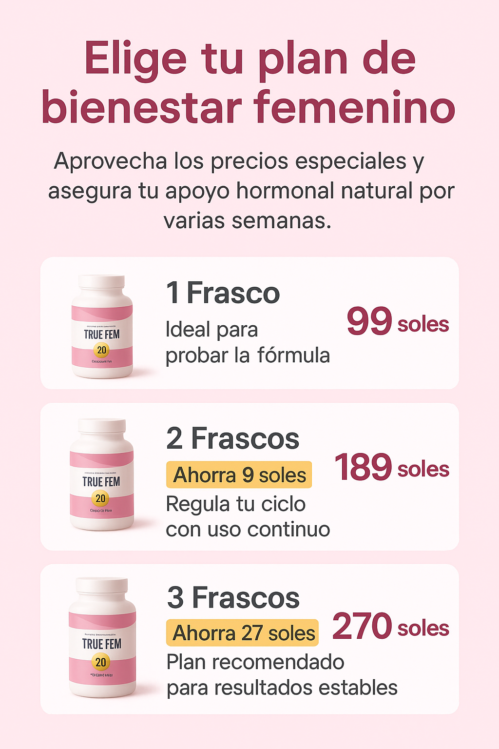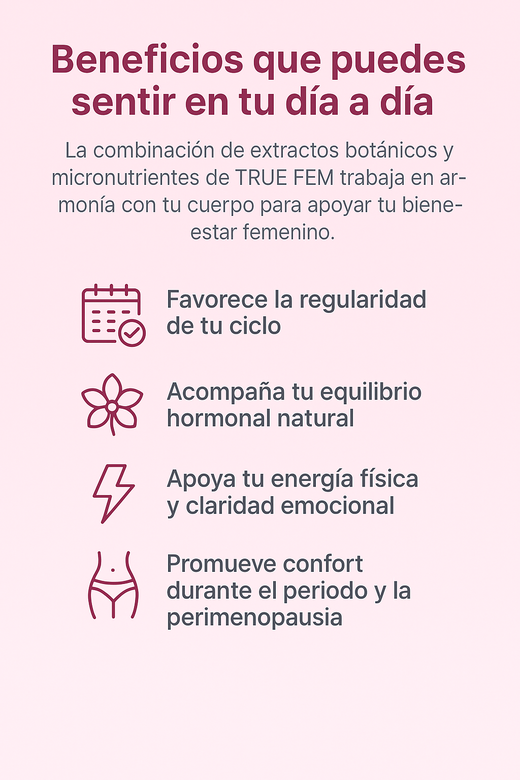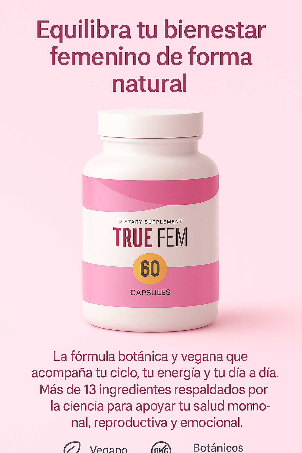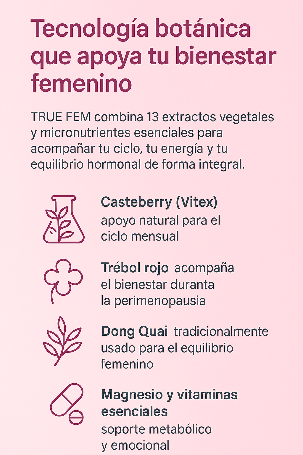 13 potentes botánicos como casteberry y trébol rojo, además de vitaminas/minerales esenciales para un apoyo holístico de la salud hormonal y reproductiva 🌸