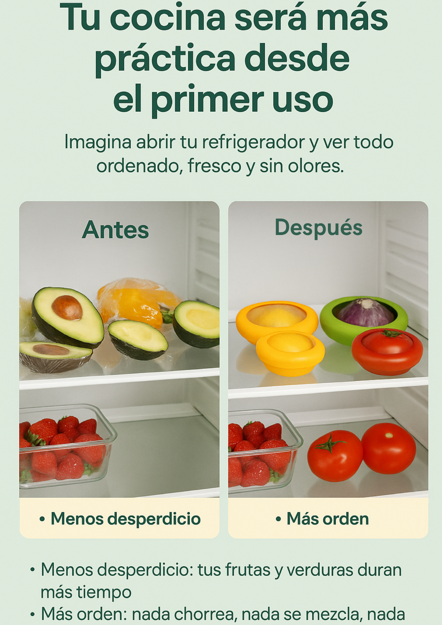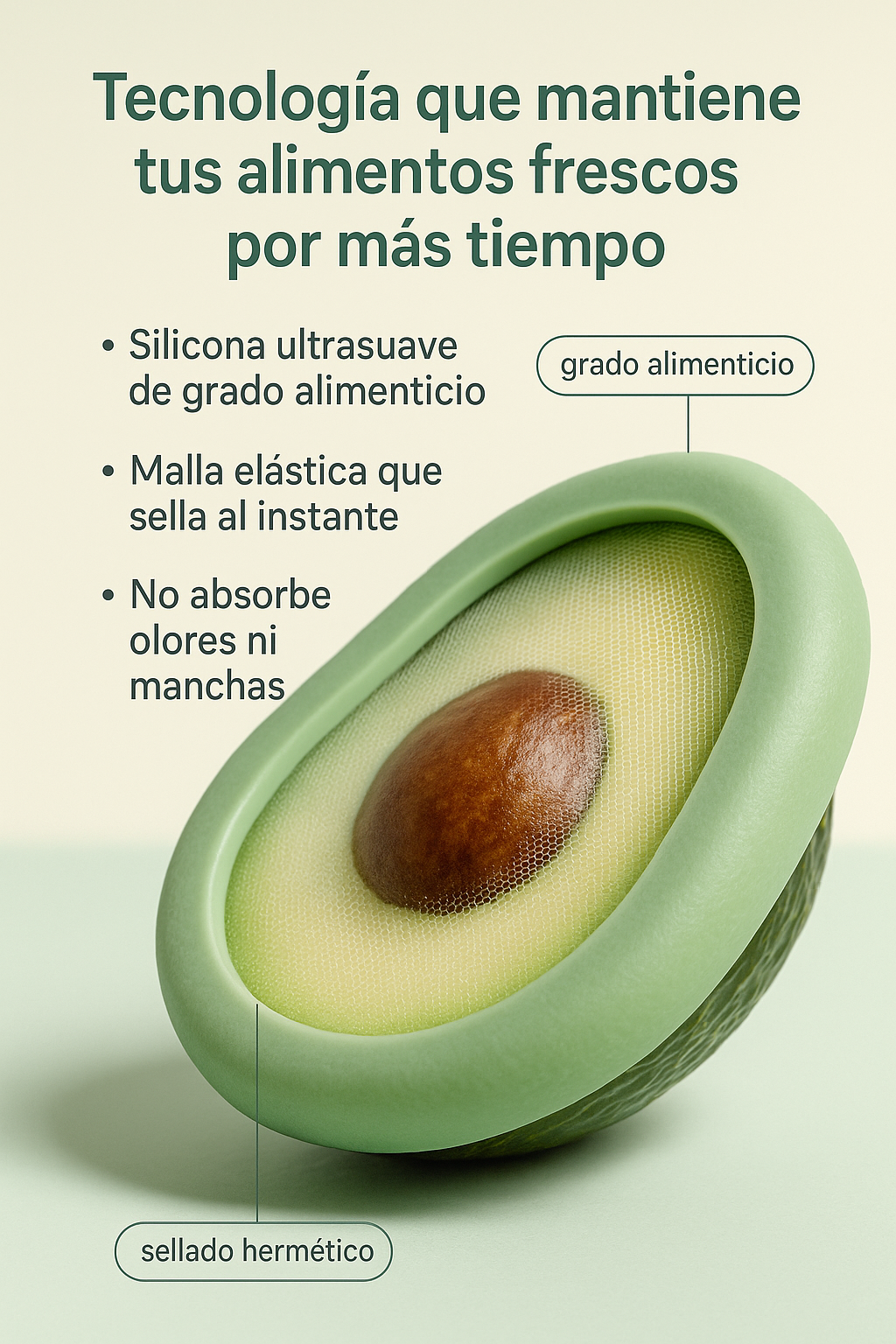 🥗 Su diseño de silicona ultrasuave se ajusta a cualquier fruta o verdura cortada, creando un sellado hermético que evita que se resequen, entren bacterias, absorban olores o se estropeen en el frigorífico.